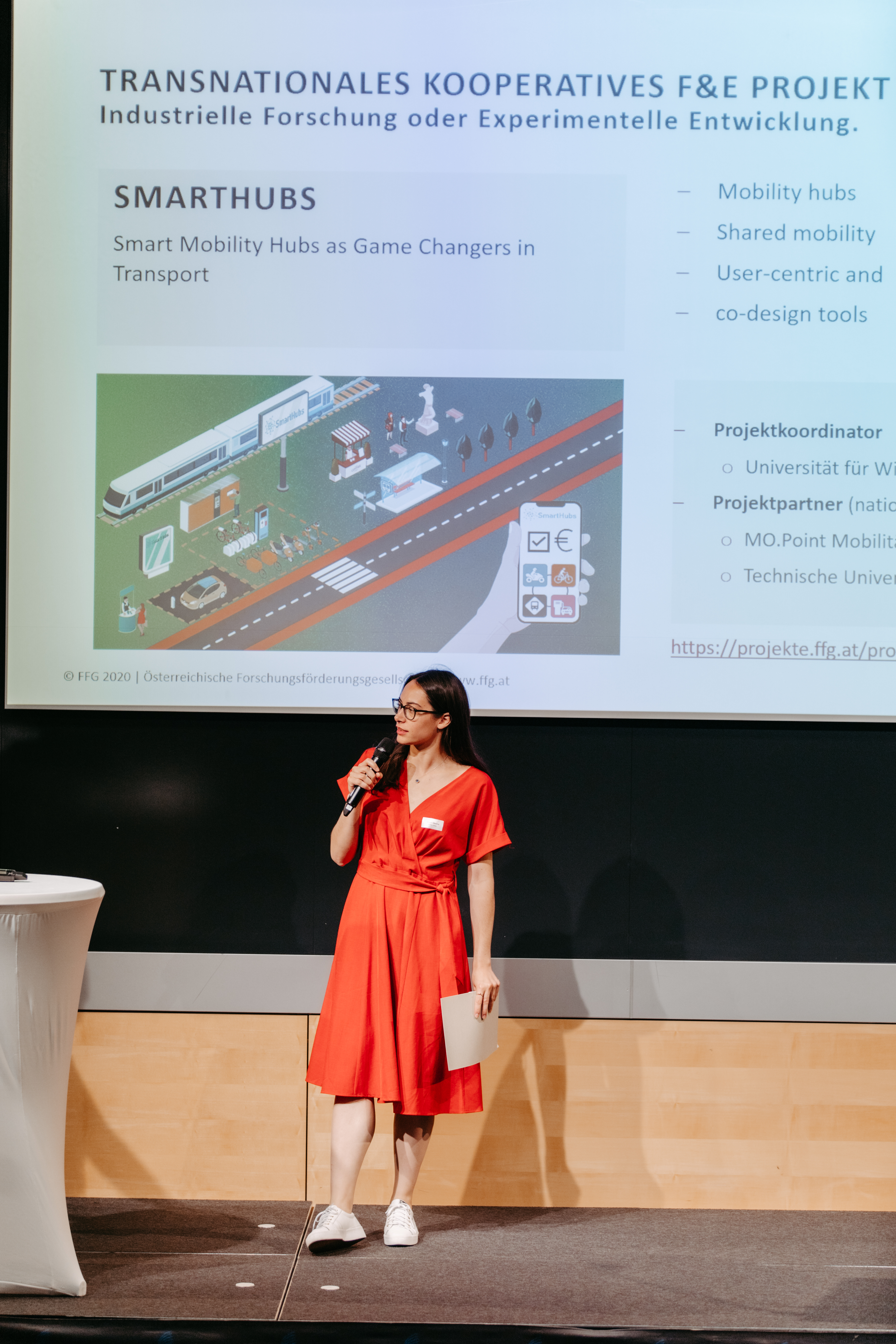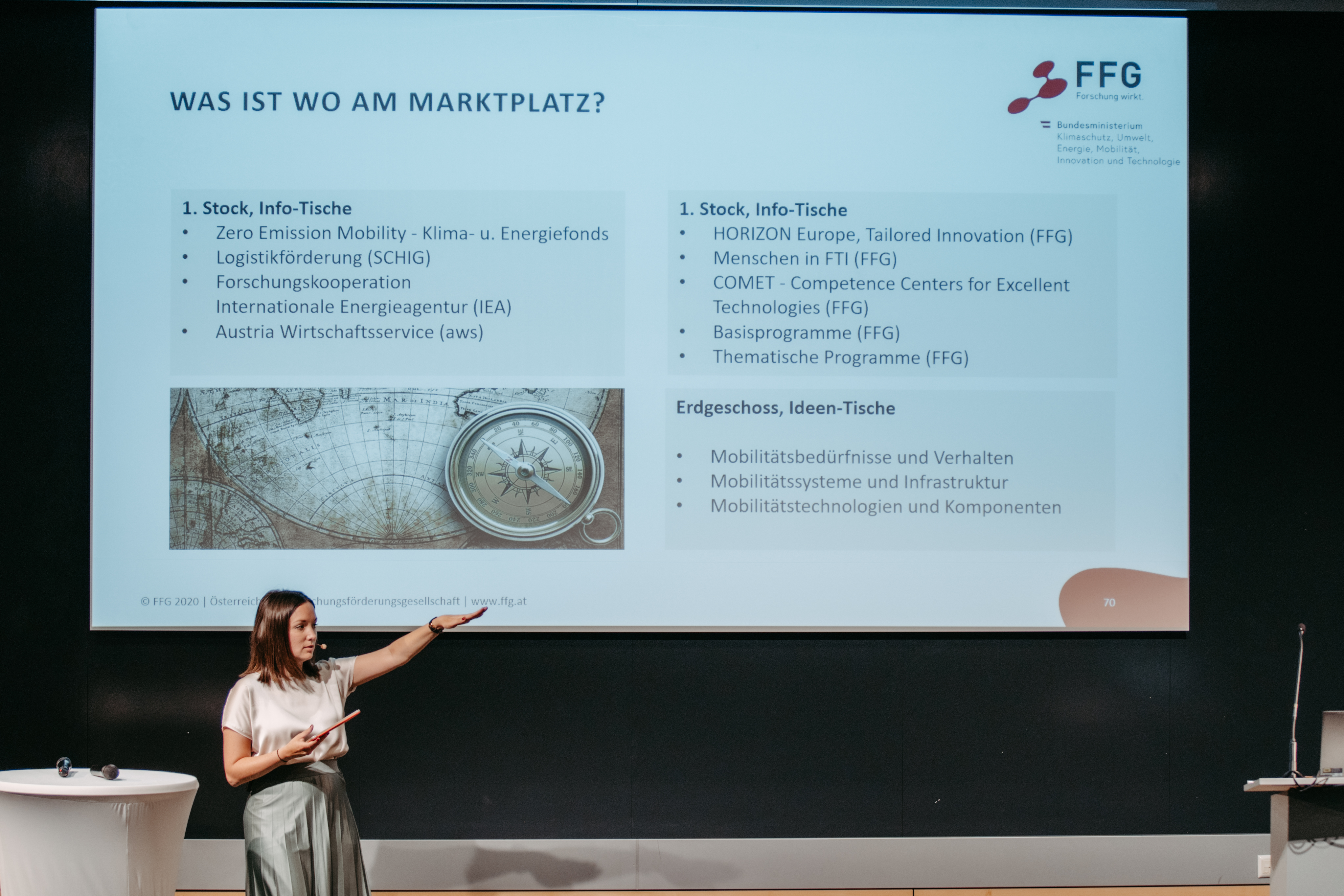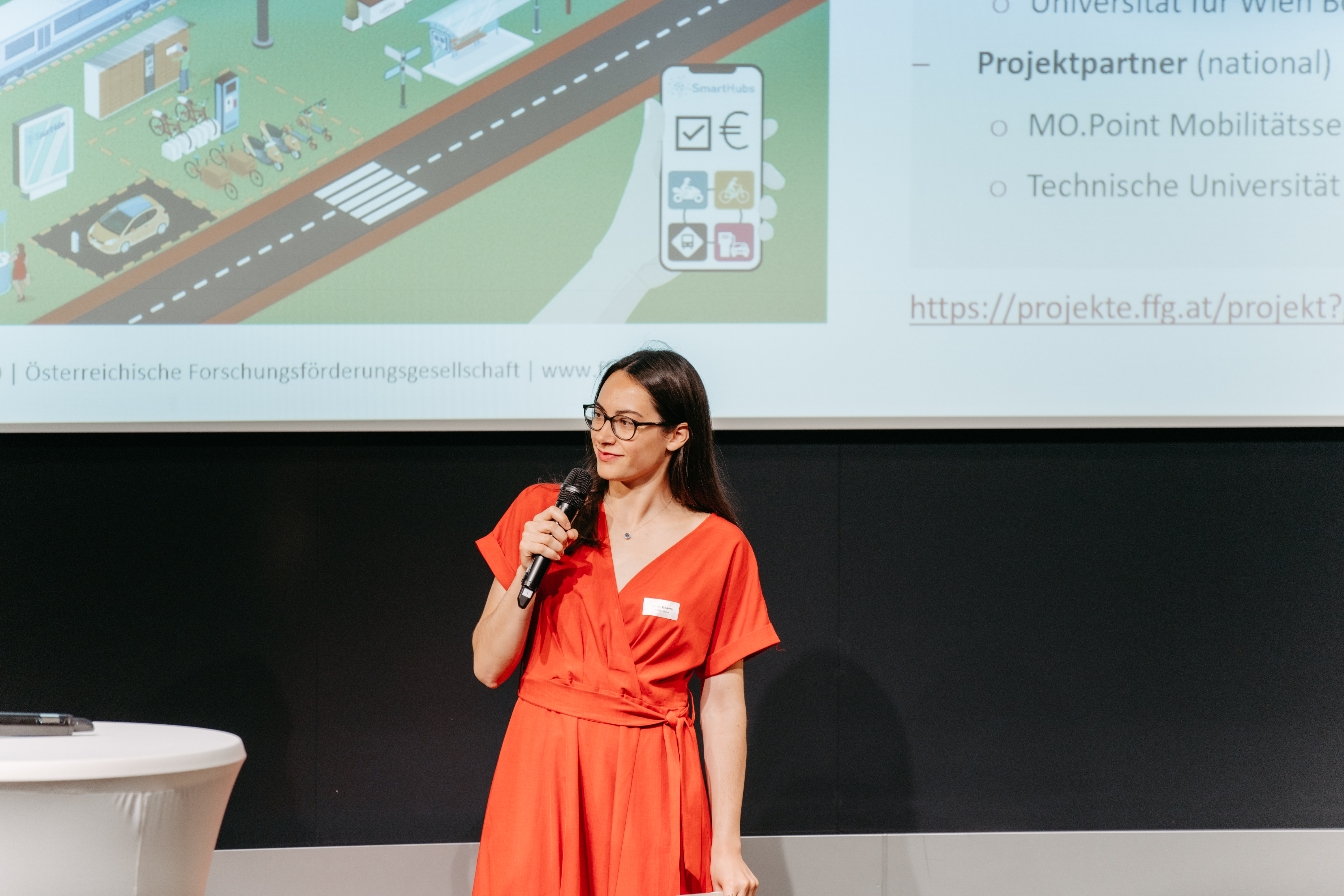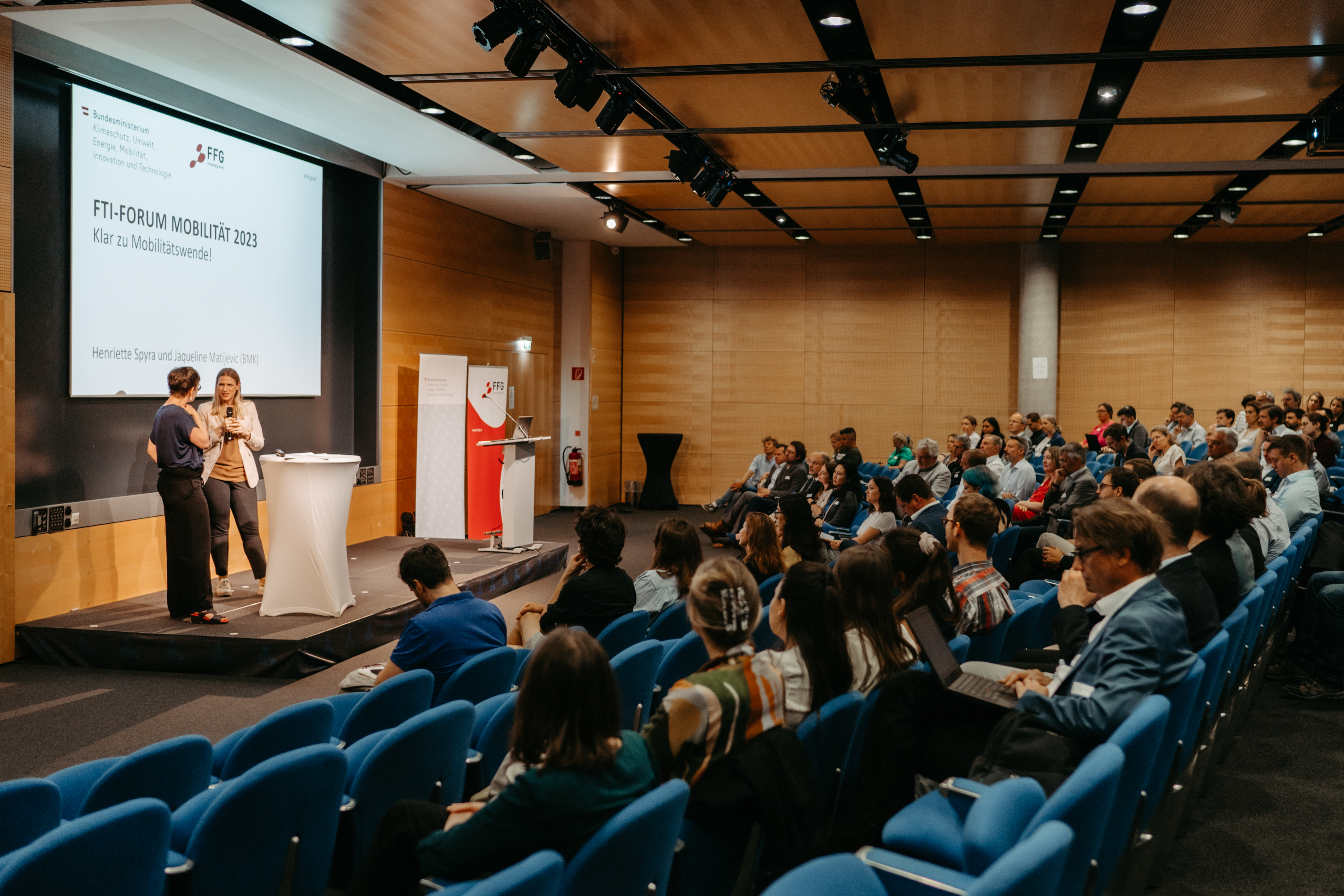 Unter der Moderation von Claudia Falkinger kamen rund 140 Teilnehmende im Wiener Techgate zusammen, um sich über die breite Auswahl an Finanzierungstöpfen für Forschung, Technologie und Innovation (FTI) für die Mobilitätswende zu informieren.