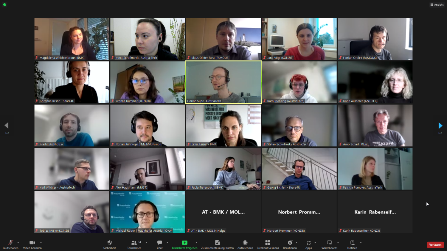 Nach einem Überblick über das jeweilige Innovationsökosystem in den FTI-Bereichen Digitalisierung (Input zum Aktionsplan Digitale Transformation der Mobilität, ITS Austria und anderen aktuellen Anknüpfungspunkten von Gerhard Menzel, BMK) und Urbane Mobilität (Input zu den Anknüpfungspunkten Mobilitätslabore, Driving Urban Transitions, Schwerpunkt Klimaneutrale Stadt von Magdalena Weichselbraun, BMK) diskutierten die Projektvertreter:innen in diesen zwei thematischen Gruppen Gemeinsamkeiten und mögliche Synergien zwischen den Projekten, darunter die Frage, wo ähnliche Zielgruppen und Probleme im Mobilitätssystem bearbeitet werden. Anschließend wurde besprochen, mit welchen über den unmittelbaren Projektinhalt hinausgehenden Austauschprozessen der Transfer von FTI-Ergebnissen ins Mobilitätssystem unterstützt werden kann. Die Ergebnisse fließen in die weitere Gestaltung von FTI-Maßnahmen des BMK ein.